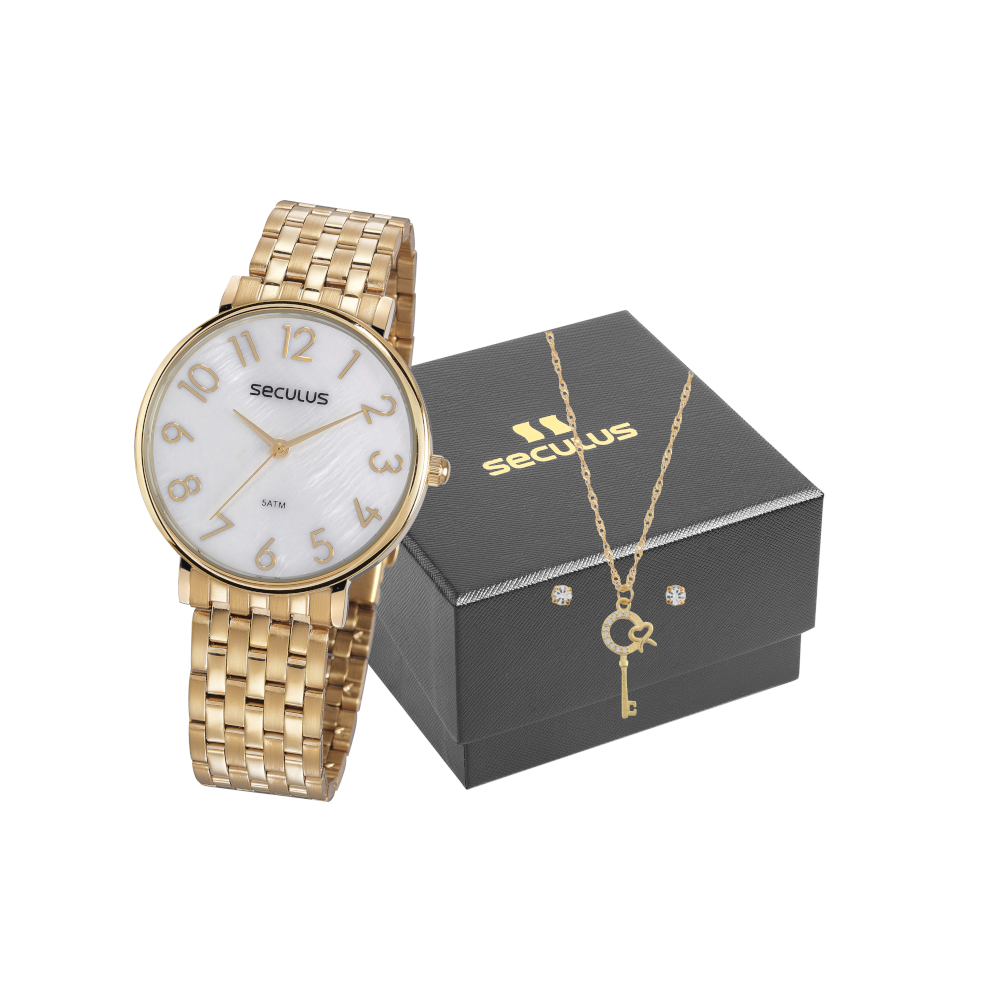 RELÓGIO SECULUS CAIXA E PULSEIRA AÇO DOURADO.