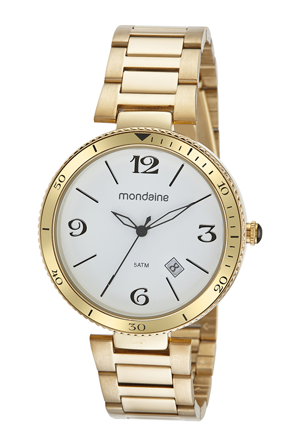 RELÓGIO MONDAINE CAIXA E PULSEIRA AÇO DOURADO.