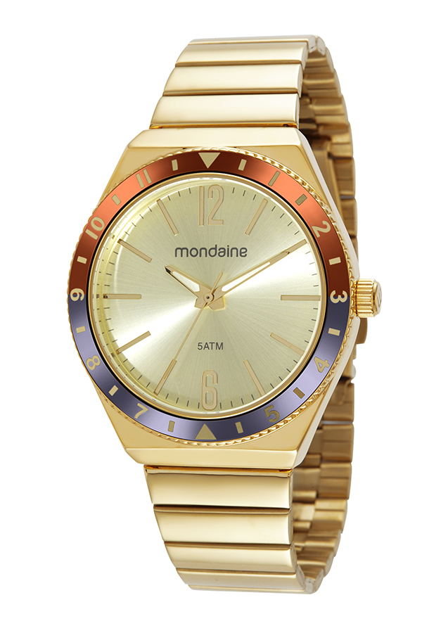 RELÓGIO MONDAINE CAIXA E PULSEIRA DE AÇO DOURADO.